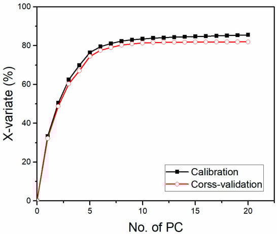 For the SVMR model, the performance was not so ideal (see Table 3) with an of 0.8816 and of 0.8858. The distinct differences of RMSEC, RMSECV, and RMSEP implied the over-fitting problem of the model. This might be due to too many independent variables of the spectral data [1]. In that case, PCA was applied here as a data reduction method to obtain a more effective regression model. According to Figure 8, the first 17 PCs were used which explained more than 85% variance of the data. Relatively good performance of SVMR could be acquired, where and were 0.9979 and 0.9879, respectively, and the problem of over-fitting was relieved a great deal, for the close value of RMSECV and RMSEP [47]. The calibration result showed SVMR as an effective method dealing with matrix effects. However, the problem of overfitting could not be avoided, comparing the results of calibration and cross-validation for SVMR (see Figure 7).