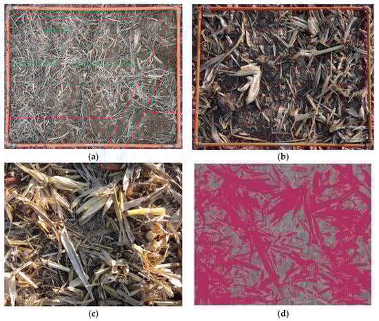 Examples of vertical photographs taken over soybean (a) and corn (c) fields. The photograph-grid method used superimposed, uniformly spaced 10 by 10 digital grid intersections (b). The app estimated crop residue is displayed in (d) as a thematic classified map using a two-color palette legend (residue class in red vs. no-residue class in gray. (c,d) show an example of the app method input and output. This example shows an evident underestimation of the app-derived crop residue compared to that from the photograph-grid method (i.e., 62% vs. 88%, respectively).