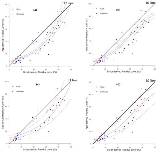 The bias between the app measurements and both the photograph-grid and script methods were analyzed in this study (Table 3). For the photograph-grid method, the biases were generally under 10% for all the data (−6.3%) with a notable exception for fields with ≥30% residue covers (bias of −12.1%). For the script method, the biases were higher than those for the photograph-grid method (−10.8%) and under 15% overall (except for medium level residue; Table 3). Among all the significantly correlated residue estimates, fields with <30% residue cover showed the lowest biases (2.1% and −4.6%) and RMSE (6.5 and 7.9%) for both methods, respectively. This study also showed that soybean and corn residue covers have different trends in regard to the method used. Indeed, the bias of the app residue measurement compared to the photograph-grid method has higher for corn than soybean (−6.4% vs. −5.3%); whereas, corn residue measurements compared to the script method has lower bias than soybean (−9.6% vs. −12%). This finding (soybean residue cover has higher bias than corn) is consistent with other residue estimating studies in which errors were higher on soybeans compared to corn [20,21].