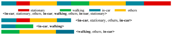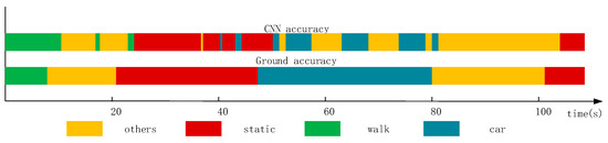 Figure 1 shows that there is a large amount of noisy data when the CNN method is used in a natural environment. The states are not easy to distinguish. As it shown, there are two bands: the upper band named CNN accuracy and the lower band called ground accuracy. The ground accuracy is the authentic movement results in natural environment and can be considered as the reference of CNN accuracy results which are based on CNN method. From this figure, we can see that there is a large amount of noisy data. For example, during the 60 s–80 s, the real state of user’s movement was “car” (driving), which can be seen in the ground accuracy band. However, when we used CNN method to recognize the current state which should have been shown the color of “car”, it generated a lot of some “others” states (yellow color) which we call noisy data.