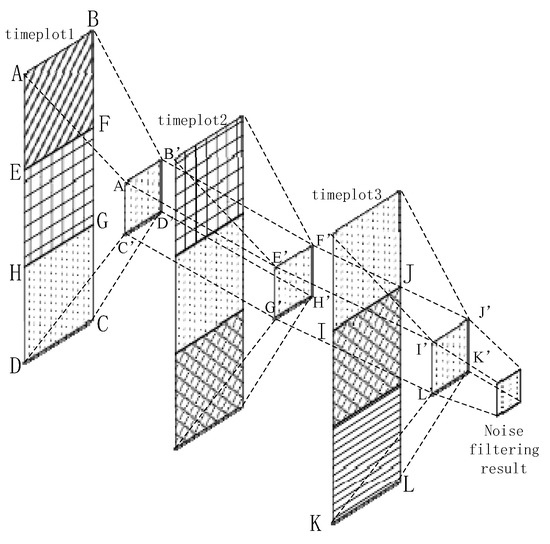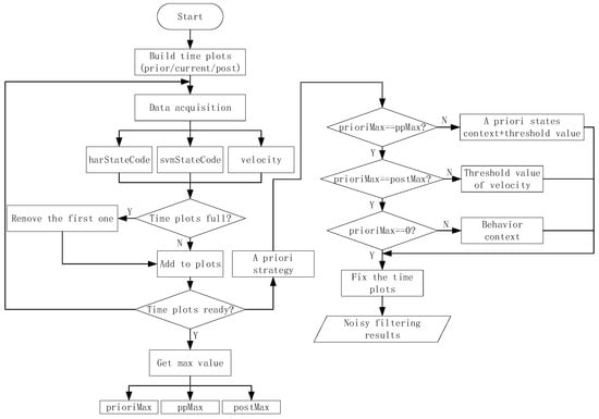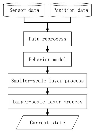 Figure 2, data are obtained from mobile phones and reprocessed in real-time. On the basis of the behavior-trained models developed using the deep learning method, we propose an MTS approach that provides two channels of abstraction. These channels enable users to reach their desired target. First, we describe a smaller scale that uses sliding time plots to remove noisy data according to the priority of the results trained from the sensors and indoor positioning technology. Second, on the basis of the results obtained from the first channel, we present a state chain method in a larger-layer to filter noisy data more extensively and to reduce the time delay when switching to another algorithm. As the final aim of recognition is to switch to the appropriate algorithm, the time delay of switching into the current state should be considered. Therefore, in this section, we first define the state codes and state events to comprehend the method more conveniently. Then, we describe the proposed method in more detail by dividing it into the following three parts: priority strategy, noise filtering with fine granularity (a smaller-scale), and optimization based on a state chain in a higher layer (a larger-scale).