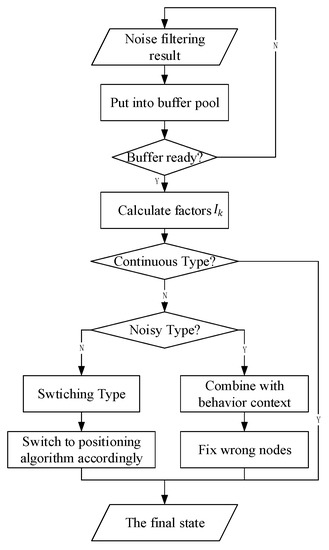 35]. This leads to failure in differentiating between similar states. For example, the stationary state and the driving state with a constant speed are difficult to recognize if the data from sensors are used. However, these states are significantly different in terms of the movement velocity, which can be obtained from an indoor positioning scene based on the features of moving objects. Therefore, we require the movement features of targets in indoor positioning environments to assist with the switching of algorithms during recognition.