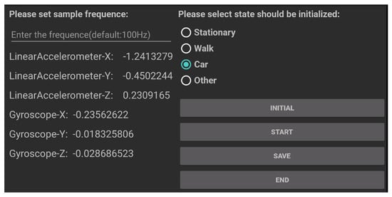 In the data collection campaign, 10 users carried phones (HUAWEI mate9, XIAOMI NOTE, MEIZU) with them. Each type of data set is at least 40 min, and the interval time is at least 20 s. We developed a simple application for collecting data; it obtains the accelerated velocity from the inertial sensors. The interface is shown in