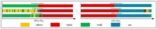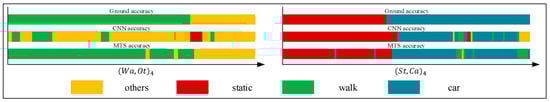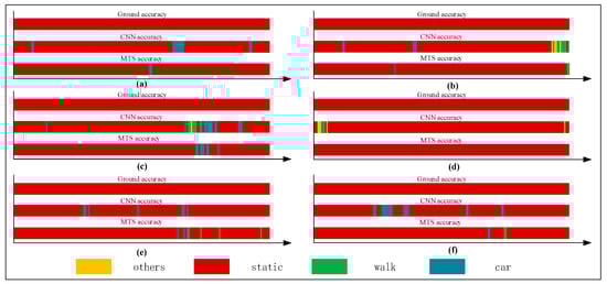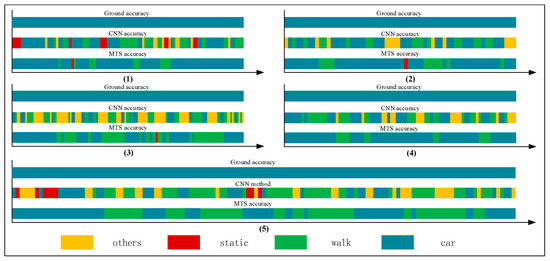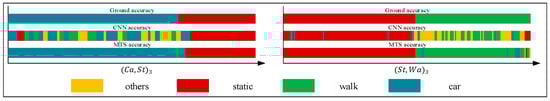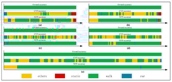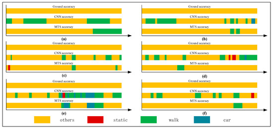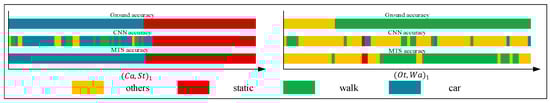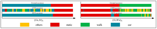 Figure 15 show that the upper, middle and bottom bands are a real situation named ground accuracy, the result of using CNN method, only named CNN accuracy, and the result of using the improved method is called MTS accuracy, respectively. For the other states, it is easy to generate noisy data in the walking state. The results are improved by approximately 21% on average in