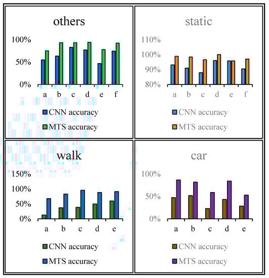 , compared with the CNN accuracy, the result of MTS accuracy was considerably improved from approximately 10.34% to at least 31.11%. For the static state, owing to its apparent and unique features that are different from those of other states, the effect of only using the CNN method is acceptable. When we employed the proposed adaptive method, the obtained result is better by approximately 5.5% on average, but the consequence of walking is increased by approximately 45.47% on average. In addition, the accuracy of the in-car state also increases by approximately 26.23%.