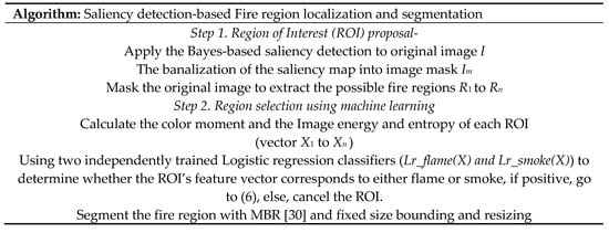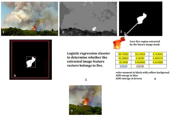 In this work, we developed a new algorithm of wildfire localization and segmentation algorithm by combining saliency detection and logistic regression classifier (Figure 3). It can quickly locate the core fire region out of a complex background. An example of the method is illustrated in the Figure 4.