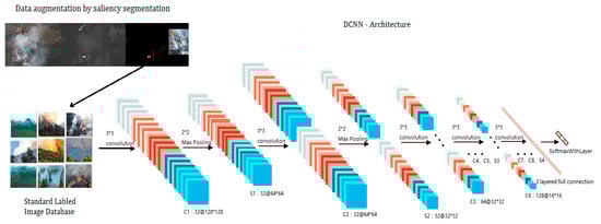 The overall architecture is illustrated in Figure 5. The left part is the image saliency segmentation and image cropping stage. The right part is the core DCNN model. Inspired by Alexnet (eight-layered DCNN) [25], we proposed a deeper 15-layered DCNN model ‘Fire_Net’. Its structure is detailed in Table 2. With its self-learning structure, it can extract wildfire features from low to high level. The first 12 layers consist of 8 convolutional layers (Conv1–Conv8) and 4 max pooling (Pool1–Pool4). The convolutional layers extract the fire features from low to high level. The max pooling layers are used to capture deformable parts and reduce the dimension of the convolutional output. The last three fully connected layers (FC1, FC2, and IP3) capture complex co-occurrence statistics. A final classification layer summarize the previous abstracted high level features for the recognition of a given image. This architecture is appropriate for learning complex wildfire features from the training dataset. The complete schematic of the DCNN model can be found in Reference 1.