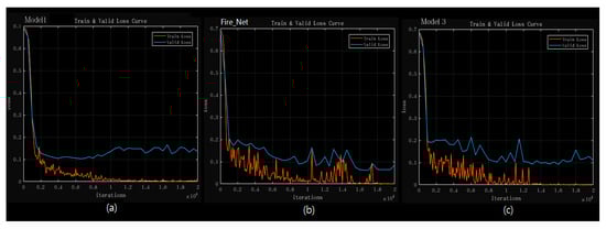 Training and validation loss curve of the three models: (a) Model 1; (b) Fire_Net; (c) Model 3. The curve is computed over an epoch of 20,000 iterations. The training loss is marked every 100 iterations while the validation loss is recorded every 500 iterations.