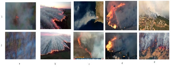 We further evaluated Fire_Net’s generalization performance on a set of 40 sampled image from wildfire news reports. These samples are aerial images of Bilahe forest fire, in Noth China 2017(a); Mongolia Forest fire, in China, 2017(b); Envisat satellite image of wildfire in Southern California, USA. 2007(c1); Kern county wildfire, CA, US, 2016(c2); Var wildfire, south France, 2017(d); La Tuna and Napa Valley wildfire, CA, US, 2017(e); etc. All these samples are correctly classified as fire images: the output of Fire_Net ranges from 0.9765 to 1 for fire class, while for no-fire class, it is from 1.0064 × 10−8 to 0.0235. This indicates that strong fire features are presented in these images (see Figure 11).