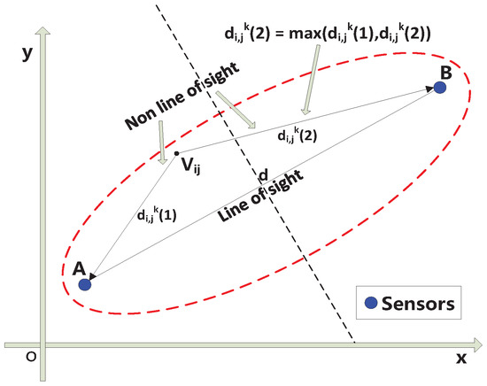 To improve the localization accuracy, the elliptical model, which represents the communication link, is divided into line-of-sight (LOS) and non-line-of-sight (NLOS) paths [1]. The proposed elliptical model in [1] is illustrated in Figure 1, where A and B are sensors; d is the distance between A and B; is the center of voxels in the ellipse area, i and j are the indices of voxels, ; k is the index of links, which are expressed as ellipses in the experiment scenario; is the distance between voxels A and , and is the distance between B and . Based on the above elliptical model, we propose a new weighted formula as follows: