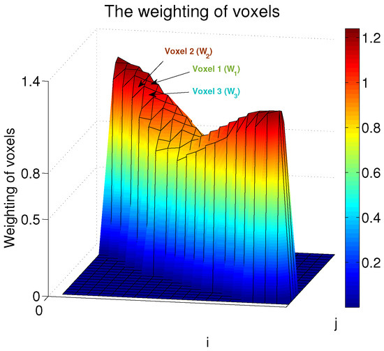 In order to validate the rationality and validity of the proposed weighted formula (1) , the weightings of voxels in one of the communication links are computed based on the formula in (1) and the data in [2], and the results are depicted in Figure 2, where Voxel 1 is on the LOS path in the link, while Voxels 2 and 3 are on the NLOS paths. , , represent the weightings of the Voxels, respectively. It is demonstrated that the values of and can always meet the description “when a target stands on a line-of-sight (LOS) path, the influence on the communication link is greater than when a person stands on a non-line-of sight path inside the same weighting area” and the description “the less are the distances between voxels and the nearest sensors in the same link, the greater are the weightings values”.