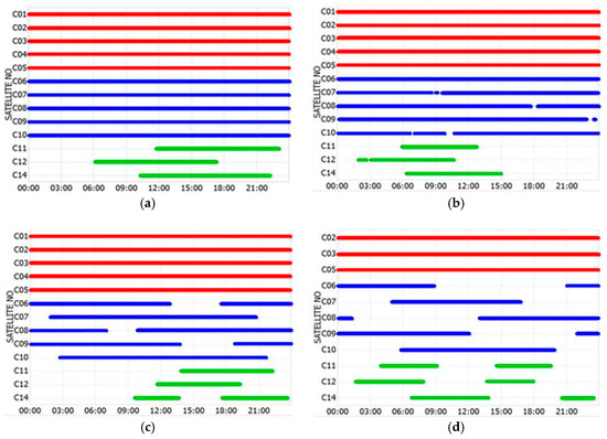 BDS satellite visibility at four sites in the northern hemisphere on Day 029/2015. SIN1 (a), DLTV (b), JFNG (c), and KZN2 (d). Red, blue, and green represent GEO, inclined geosynchronous satellite orbit (IGSO), and medium earth orbit (MEO) satellites, respectively.
