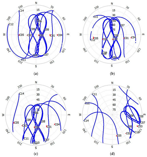 Figure 2 presents the sky plots of all satellites against the satellite azimuths and elevations at four sites on Day 029/2015. It can be seen that the satellite elevation setting for the raw data of each site is different; however, this does not affect our analysis. These figures clearly show the elevation and azimuth variation of GEO, IGSO, and MEO at each site at different latitudes. The elevation of GEO is almost constant, but that of IGSO and MEO varies greatly. Similarly, a comprehensive consideration of the sites in the southern hemisphere shows that the satellite elevation of GEO decrease with the latitude of the site, and will become almost invisible when the latitude of the site increase above 67° (at CAS1). Therefore, it is impossible to monitor ionospheric TEC using BDS GEO satellites in the Antarctic and Arctic regions.