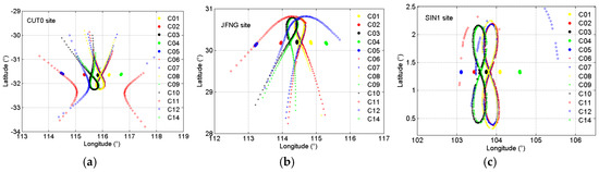 Ionospheric pierce point (IPP) of BDS satellites observed at site CUT0 (a), JFNG (b), and SIN1 (c) on Day 029/2015.