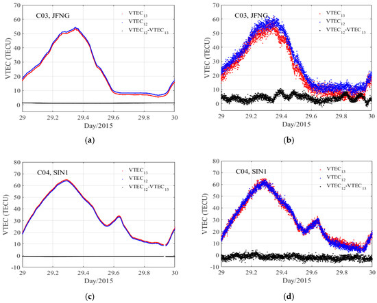 VTEC12, VTEC13, and the difference between the two groups for GEO satellites on Day 029/2015. Smoothed code: JFNG (a), SIN1 (c); Code: JFNG (b), SIN1 (d).
