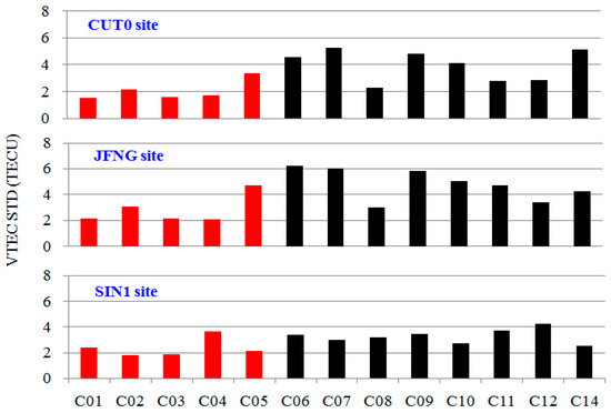 STD of differences between IGS GIM and VTEC12 for BDS satellites at site CUT0, JFNG, and SIN1 from 1 January 2015 to 31 December 2015. Red represents GEO satellites, and black represents IGSO and MEO satellites.