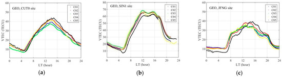 Figure 6 presents the continuous VTEC derived from five GEO satellites at CUT0, JFNG, and SIN1 site on Day 004/2014. We can see that there are slight differences in the absolute VTEC value for different satellites at the same site, primarily because the IPP for each satellite is not the same. The VTEC variations clearly show two extremum points, the peak and the minimum, which are closely related to the local solar altitude. It can be seen that for the sites CUT0 and SIN1, the minimum appears at about 5:00, but for the site JFNG it consistently lasts until about 6:30. The difference between the extremum points is clearer than that of the minimum points. The maximum values of the VTEC for site CUT0 appear at approximately 14:00, those for site SIN1 appear at 12:00, and some increasing values of VTEC can be also seen at about 15:00, and for site JFNG the maximum appears for different satellites at different times. The time of the maximum VTEC and the VTEC sequence for C05 at sites CUT0 and JFNG are significantly different from that of other satellites, and this may be related to projection function error and the quality of the observation after the initial analysis. The measurement noise and multipath of C05 is larger than that of other satellites, because the satellite elevation of C05 is very low, about 17°.