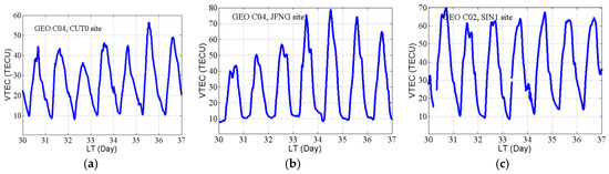 Day-to-day variation of VTEC derived from GEO satellites on Days 30–36/2014. CUT0 (a), JFNG (b), SIN1 (c).