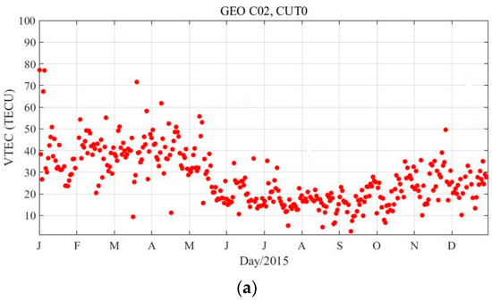 In this section, we select three sites named CUT0, SIN1, and JFNG for analysis, as they are located in the southern hemisphere, near the equator, and in the northern hemisphere, respectively. The VTECs are computed using the smoothed code observations during 2013 and 2015. Some analysis results of the ionospheric TEC sequence variation over time are used to demonstrate the characteristics of the GEO satellites in ionospheric monitoring.