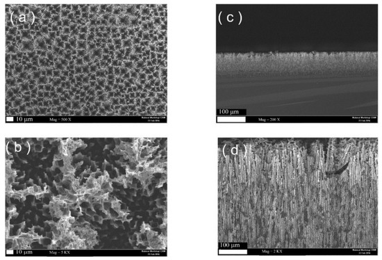 Initially, a visual inspection at the surface of the fabricated MPS shows the formation of a smooth light brown color membrane on the Si wafer surface, which confirms the formation of the pores. The micro image of the fabricated MPS sample is depicted in Figure 1. The nearly uniform distribution of the formed pores on the Si surface is clear from the image (Figure 1a). The average pore size was in the range of 4–6 microns. On the other hand, a cross-section image of the same fabricated sample reveals that the depth of the fabricated MPS was approximately 80 microns (Figure 1c), which makes it a suitable candidate for amperometry-based electrochemical sensors [11]. In addition, Figure 1b,d depicts a larger magnification of the above images, it also shows the large surface area of the pores, which result in a higher exposed surface area of the MPS with the analyte.