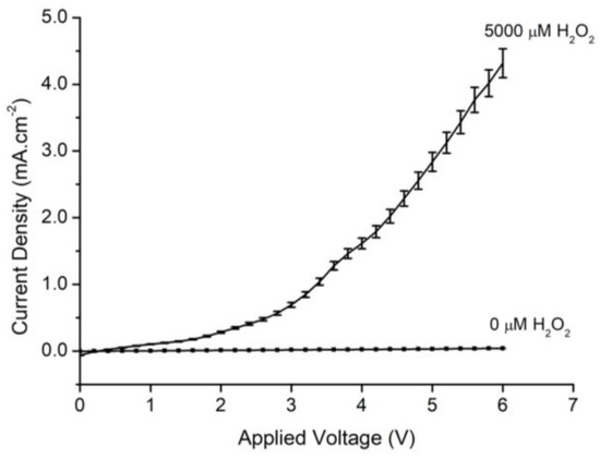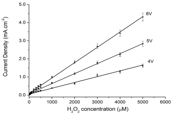 The effect of applied voltage at 4 V, 5 V, and 6 V on the current values measured at various amounts of H2O2 can be seen in Figure 4. The increase of the current with the applied voltage is noticeable.