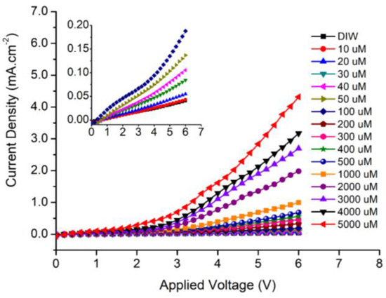 Figure 3. The current density versus the applied voltage with different H2O2 concentrations. The inset figure shows the details of low H2O2 concentrations (DIW to 100) μM.