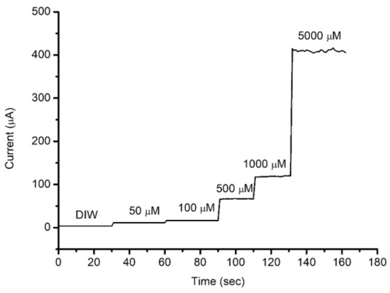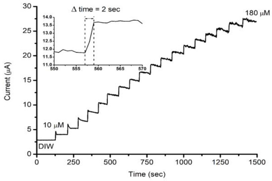 The dynamic current-time (I-t) behavior was also tested for the manufactured electrode. The stock solution was diluted so that each drop of the diluted sample was equivalent to 10 μM in a 20 mL DIW cell. The applied voltage was fixed at 5 V, and the solution was continuously stirred. Figure 5 reveals the I-t behavior of the manufactured MPS electrode, the rapid response at each drop of H2O2 is noticeable, with a response time of approximately two seconds.