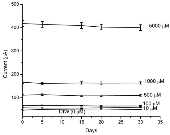 Figure 7. The stability of the measured current for one month at an applied voltage of 5 V. The concentrations of H2O2 were 0, 10, 100, 500, 1000, and 5000 μM.