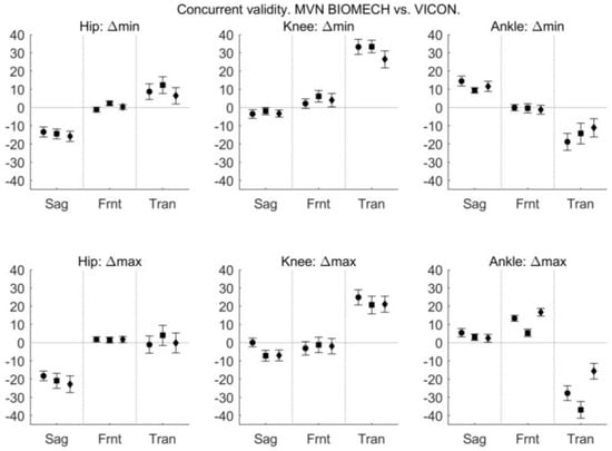 | Xsens Hip | Min | −21.9 (3.8) | −21.4 (3.7) | −0.6 [−2.0, 0.9] | −5.1 (5.2) | −2.5 (7.0) | −2.6 [−5.4, 0.2] | −1.9 (6.0) | 1.3 (7.3) | −3.2 [−5.4, −1.1] |