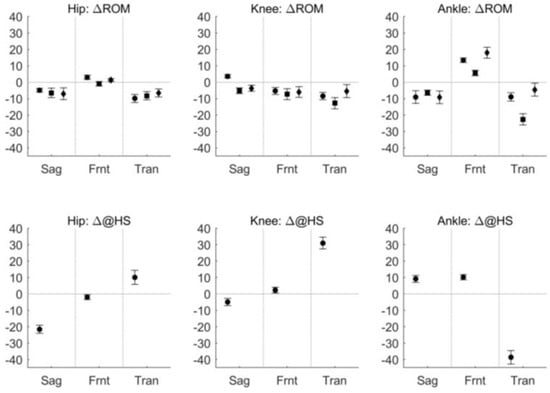 | Vicon Hip | Min | −8.2 (3.3) | −8.4 (3.4) | 0.2 [−1.1, 1.5] | −8.0 (4.8) | −8.7 (4.6) | 0.7 [−1.1, 2.5] | −9.2 (4.8) | −9.1 (4.8) | −0.1 [−1.8, 1.6] |
