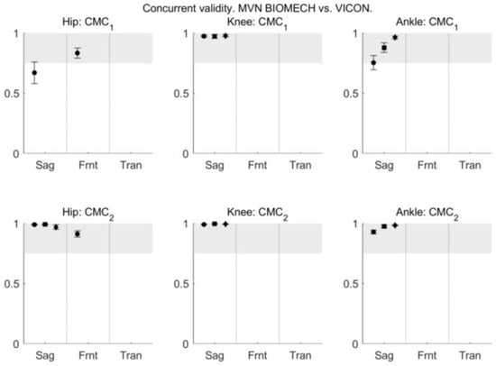 - Ferrari, A.; Cutti, A.G.; Cappello, A. A new formulation of the coefficient of multiple correlation to assess the similarity of waveforms measured synchronously by different motion analysis protocols. Gait Posture 2010, 31, 540–542. [Google Scholar] [CrossRef] [PubMed]