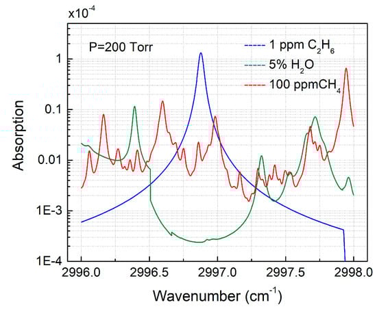 C2H6 has its strong fundamental absorption lines in the mid-infrared spectral range (near 3.3 μm), which permit sensitive and selective detection of atmospheric gases in this spectral range. Within this wavelength region, the potential spectral interference originates mainly from water (H2O) and methane (CH4). The concentration levels of H2O and CH4 in air are typically <5% and ~1.8 ppmv, respectively. Therefore, HITRAN absorption spectra of 1 ppmv ethane, 100 ppmv methane, and 50,000 ppmv water at 200 Torr gas pressure and a 3 cm effective optical path length are depicted in Figure 1. The selection of the low gas pressure avoids spectral overlap. A strong C2H6 absorption line at 3336.8 nm (2996.88 cm−1), which is free from spectral interference of other atmospheric gases (such as CH4 and H2O), was selected as the optimum target absorption line.