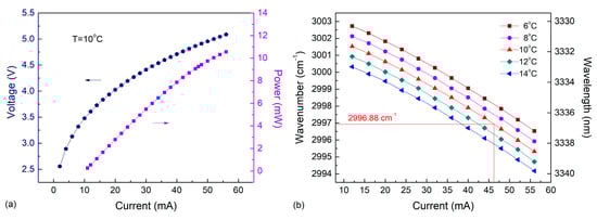 Measured laser characteristics for the 3.3 μm CW TEC ICL at different operating temperatures and injection currents. (a) ICL output power and voltage as function of current at 10 °C; (b) ICL wavelength (in cm−1) as function of ICL current at five temperatures.