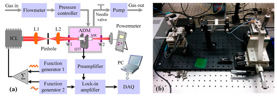A schematic of the QEPAS based C2H6 sensor is shown in Figure 3a. The ICL is equipped with a collimation lens and emits single-mode radiation at a center wavelength of 3337 nm. The collimated beam that exits the TO66 header then passes through a pinhole to reduce the beam diameter due to the fact that the diameter of the original collimated beam is ~6 mm, which is wider than the 300 μm gap between the two prongs of the QTF. The spatial filter consists of two plano-convex CaF2 lenses (L1 and L2) with the focal lengths of 5 cm and 4 cm, respectively, and a pinhole with a diameter of 300 μm positioned at the focus position of the two lenses, L1 and L2. The output beam from the spatial filter is directed to an ADM. The ADM includes a standard QTF and two thin metallic tubes with 4 mm length and 0.8 mm internal diameter, which act as acoustic micro-Resonators (AmR) [26]. The ICL beam must be focused through the tubes and the gap between the prongs of the QTF in order to avoid photo-thermal effects and minimize background noise sources [19,27]. A power meter (Ophir, model 3A) is used to monitor the power of the beam after the ADM, verifying that the ICL beam completely passed through the ADM. The ADM is placed in a gas enclosure with a gas inlet and outlet. A pressure controller (MKS Instruments, Inc., USA, model 649) and a vacuum pump are employed to control and maintain the pressure inside the ADM. A needle valve and flow meter are used to control and monitor the gas flow in the sensor system. A photo of the optical system is shown in Figure 3b.