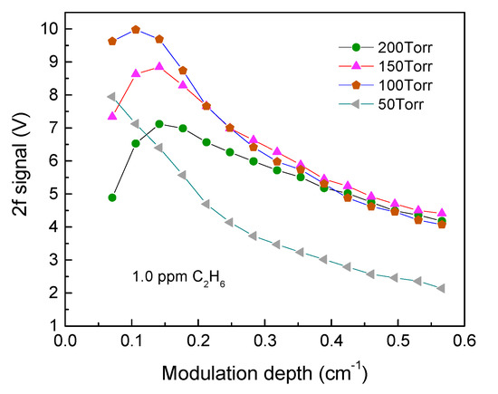 In order to obtain the best sensor system detection sensitivity, the gas pressure and modulation depth for wavelength modulation spectroscopy (WMS) should be optimized [28,29]. A certified standard cylinder containing 1 ppmv C2H6 balanced by UHP N2 was employed for the optimization of the ethane sensor system. For each individual pressure ranging from 50 Torr to 200 Torr, the amplitude of the 2f signals was recorded with different modulation depths as depicted in Figure 4. The results demonstrate that the maximum 2f signal of this QEPAS system is observed at 100 Torr and with a modulation depth of 0.106 cm−1. For the same modulation depth, the 2f signal amplitude at a pressure of 200 Torr is 34.6% lower than the maximum value. The 2f signal increases with the modulation depth and decreases when the modulation depth is >0.106 cm−1.