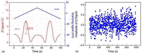 A sinewave signal with a frequency of 16.3 kHz and amplitude of 0.016 V was used to modulate the ICL wavelength, leading to a modulation depth of 0.106 cm−1. The driving current and laser temperature were set to 47 mA and 10 °C for the ICL wavelength to be centered at 2996.88 cm−1. The pressure in the ADM was set to 100 Torr in order to avoid spectral interference from CH4. The signal from the QTF was first sent to the lock-in amplifier and then to a DAQ card. The sampling rate of the DAQ card was set to be 1 kHz. With a 1 s lock-in integration time, the 2f signal was acquired using a triangular wave with a frequency of 0.01 Hz and a peak-to-peak amplitude of 20 mV by scanning the laser wavelength. A spectral scan corresponding to a C2H6 concentration (1 ppmv) is depicted in Figure 5a. The amplitude of the 2f signal is ~8.44 V. The background noise was measured by flushing the ADM with ultra-high purity (UHP) nitrogen for one hour, as shown in Figure 5b. The noise level (standard deviation for one hour) is ~0.12 V. In this case, the calculated SNR, which was defined as the ratio of the signal amplitude to the 1σ noise level, was ~70.3. A minimum ethane detection sensitivity of 1 ppmv/70.3 ≈ 14 ppbv can thus be estimated.