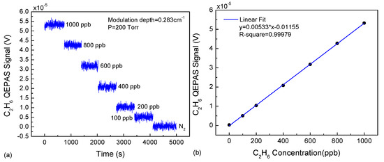 The results of max(2f) for different diluted C2H6 concentrations are depicted in Figure 6a. Then, the recorded max(2f) and the linear dependence of the averaged 2f signal amplitude as a function of C2H6 concentration were observed and are plotted in Figure 6b. The calculated R-square value is equal to 0.99979 after a linear fitting procedure, which implies that this QEPAS sensor exhibits excellent linearity for monitoring C2H6 concentrations. The relationship between the 2f amplitude and the concentration can be expressed as