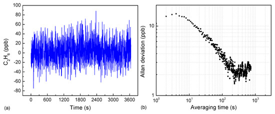 Allan-Werle deviation measurements were performed to investigate the time stability of the C2H6 sensor. The C2H6 sensor operated with pure N2 for a period of ~1 h was carried out, and the output results that corresponded to the fluctuation of the sensor output in the absence of the C2H6 were recorded. An Allan-Werle variance was utilized to analyze the time stability and minimum detection limit (MDL) for this technique. Figure 7a,b exhibits the measured concentration and the Allan-Werle deviation as a function of the integration time t. The plot indicates that the MDL is ~11 ppbv for a 1 s measurement time, as well as ~1.5 ppbv for an optimum integration time of 230 s. The MDL obtained from Allan–Werle plot (11 ppbv) is consistent with the estimation value of 14 ppbv based on SNR and standard deviation measured at 1 ppmv.