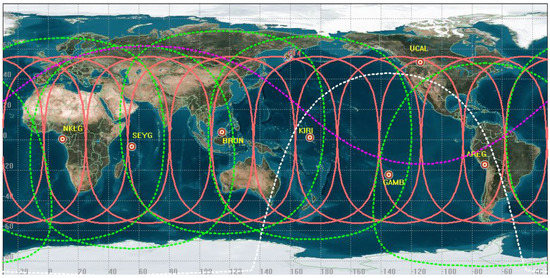 In Figure 2, the locations of the selected stations are marked as red circles. The red trajectory is for a MEO satellite on the ground during a regression period. The area of green circle is the operating range of MEO satellites monitored by the corresponding station, which is analyzed by the Systems Tool Kit (STK). The area above the purple line is the range monitored by the UCAL station (The station UCAL is located in Canada with the TRIMBLE NETR9 GNSS receiver), and the area under the white line is the range monitored by GAMB station (The station GAMB is located in French Polynesia with the TRIMBLE NETR9 GNSS receiver). The seven selected stations using the proposed method ensure that the operating range of MEO satellites can be monitored for orbital maneuver and anomaly detection all the time.