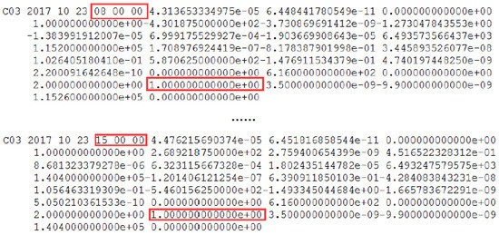 The C03 satellite is marked unhealthy in the broadcast ephemeris on 23 October 2017. The red square marks the unhealthy status and the corresponding time. C03 is unhealthy and is marked as 1 between 9:00:00 and 14:00:00, which is not shown because of the reasonable length limitation.