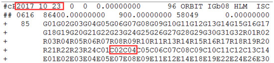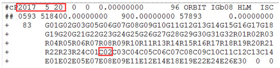 The information of the header file from the precise orbit products provided by iGMAS on 23 October 2017. The red squares mark the corresponding date and highlight the precise orbit of C03 cannot be determined.