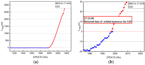 (a) The orbital maneuver detection factor of BRUN station for G03 on 10 January 2017 from epoch 1102 to 2355; (b) The orbital maneuver detection factor of BRUN station for G03 on 10 January 2017 from epoch 1975 to 2025, with a smaller range for the vertical axis. The orbital maneuver detection factors of less than 0 are indicated by blue dots. The orbital maneuver detection factors of more than 0 are indicated by red dots.
