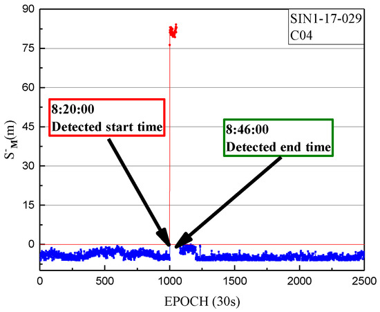 Also, the health marks of C04 and the SPP results of another site, XMIS, is used to further validate the correction of the detection results. The SPP deviations of XMIS on doy 029 of 2017 is shown in Figure 10 and Figure 11.