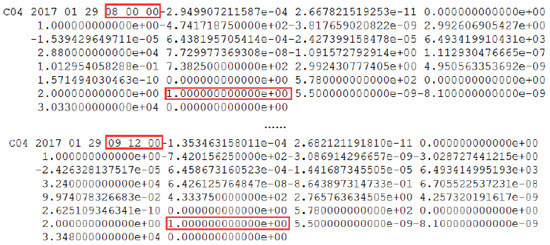 The C04 satellite is marked unhealthy in the broadcast ephemeris on 29 January 2017. The red square marks the unhealthy status and the corresponding time. C04 is unhealthy and is marked as 1 between 8:00:00 and 9:12:00, which is not shown because of the reasonable length limitation.