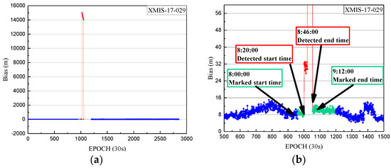 (a) The deviations of SPP on doy 140 of 2017 from epoch 0 to 2880; (b) The deviations of SPP on doy 140 of 2017 from epoch 0 to 1000, with a smaller range for the vertical axis. The deviations of SPP results in three-dimensional space corresponding to the healthy period in broadcast ephemeris are indicated by the blue dots. The SPP deviations corresponding to the detected period are indicated by red dots.