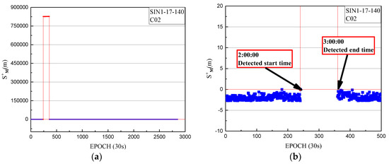 We used the health status marks for satellites (i.e., 0 for healthy status and 1 for unhealthy status) from the broadcast ephemeris provided by MGEX and the precise orbit products from iGMAS to verify the correction of the orbit maneuvering detection results. This is not shown because of the reasonable length limitation. The health status marks of satellite G03 in the broadcast ephemeris is marked as unhealthy from 15:59:44 to 21:57:52. In addition, the satellites’ orbit cannot be precisely determined using the conventional model of orbital mechanics due to the intervention of the orbiting maneuvering force. The G03 satellite misses based on the header of the precise orbit products from iGMAS for the corresponding date, indicating the correction of orbit maneuvering detection results. Therefore, the new one-step method also can be used to determine the start time of orbital maneuvers of other GNSS MEO constellations.