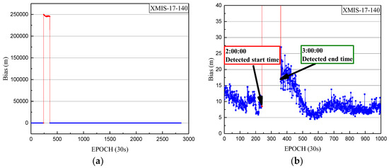 Also, the SPP results of another site named XMIS (located in Christmas Island, AU 10° 26′ S, 105° 41′ E) were used to further validate the correction of the detection results. The SPP deviations of XMIS on doy 296 of 2017 are shown in Figure 6.