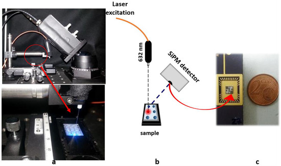 (b) The excitation light at 632.8 nm is provided by a He-Ne fiber-coupled laser. A bandpass filter, centered at 690 nm, is interposed between the sample and the SiPM sensor in order to reduce the optical noise due to the laser radiation reflected from the surface. The measurement system is automated by a customized software.