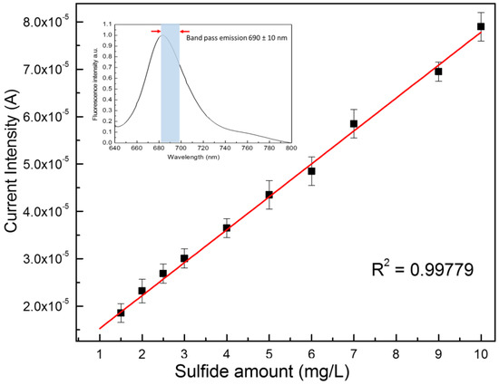 Figure 2 reports the plot of SiPM current intensities versus sulfide concentrations for the observed linear part occurring between 0 and 10 mg/L of sulfide. Data were interpolated by a linear fit giving the equation Y = 8.3 × 10−6 + 6.7 × 10−6 X (R2 0.99779). This leads to a sensitivity value of about 6.7 µA mg−1 L. The limit of detection (LoD) has been calculated by using a current value corresponding to three-times the background signal (current measured without sulfide analyte). A LoD value of about 0.5 mg L−1 (14 μM) was found.