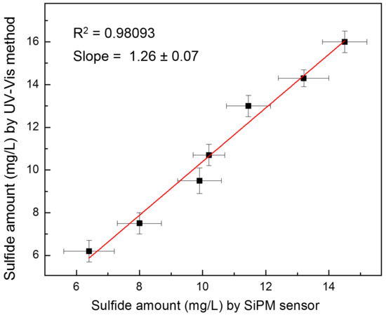Correlation between the sulfide amount measured by the silicon photomultiplier (SiPM) sensor and the standard UV-Vis method.